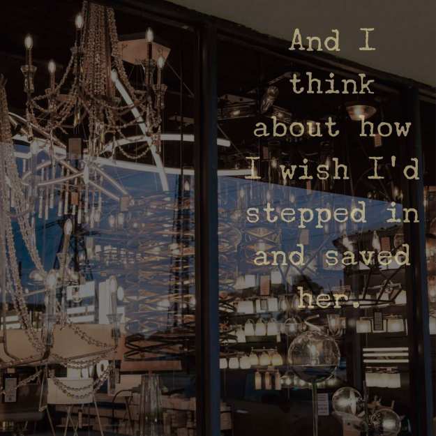 She willed her soul to transcend, escape the godforsaken Toyota Camry deathtrap and the reality of the moment, and press soft palms against storefront window of Long Island Lighting. Absorb the glitter and magic of a hundred chandeliers and lamps, all lit in tandem. She closed her eyes for a moment, and she was inside. A child again, innocent and beautiful and in awe.